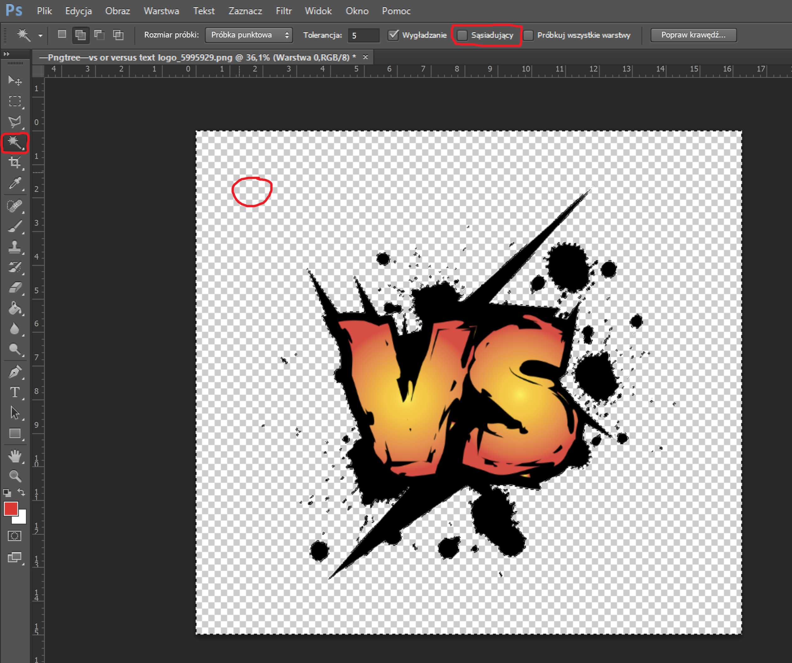 2. Wybierz narzędzie Różdżka i odznacz opcję „Sąsiadujące”.
