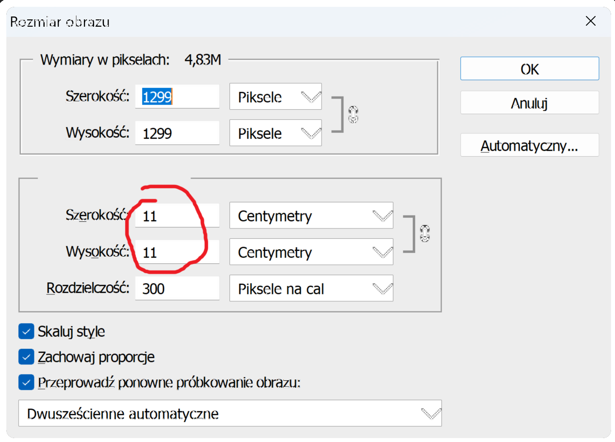 Jeśli chcesz uzyskać większy nadruk upewnij się że opcja zachowaj proporcje jest zaznaczona(np. 18 cm szerokości), wpisz żądany rozmiar, wysokość ustawi się automatycznie (teraz wiesz jakie dokładnie wymiary będzie miała Twoja grafika i możesz świadomie wybrać właściwą formatkę nadruku). Jeśli rozdzielczość to 300 DPI, możesz bezpiecznie powiększyć grafikę o około 50% bez widocznej utraty jakości. Pamiętaj, że zbyt duże powiększenie może już znacząco pogorszyć ostrość.