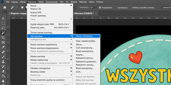 Wystarczy wybrać interesującą nas warstwę (jeżeli w oknie warstwy mamy ją pod nazwą Tło z ikoną zamkniętej kłódki musimy ją odblokować przez dwukrotne kliknięcie - po czym nadajemy jej własną nazwę - w ten sposób otrzymujemy warstwę gotową do dalszej edycji) następnie z menu wybieramy Warstwa >Styl warstwy>Opcje mieszania