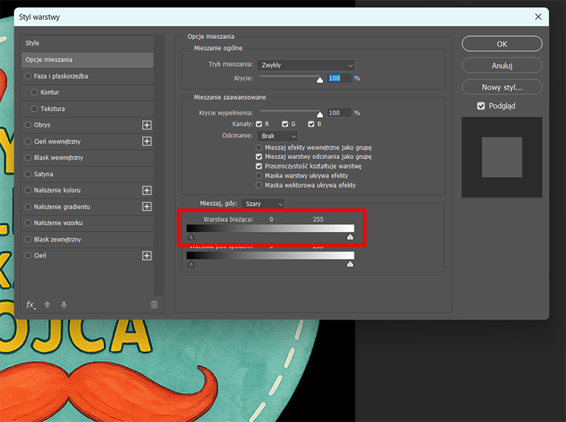 W oknie które nam wyskoczy przesuwamy jeden z suwaków w sekcji warstwa bieżąca do momentu całkowitego usunięcia tła. Suwak po lewej służy do usuwania ciemnych elementów a po prawej jasnych.